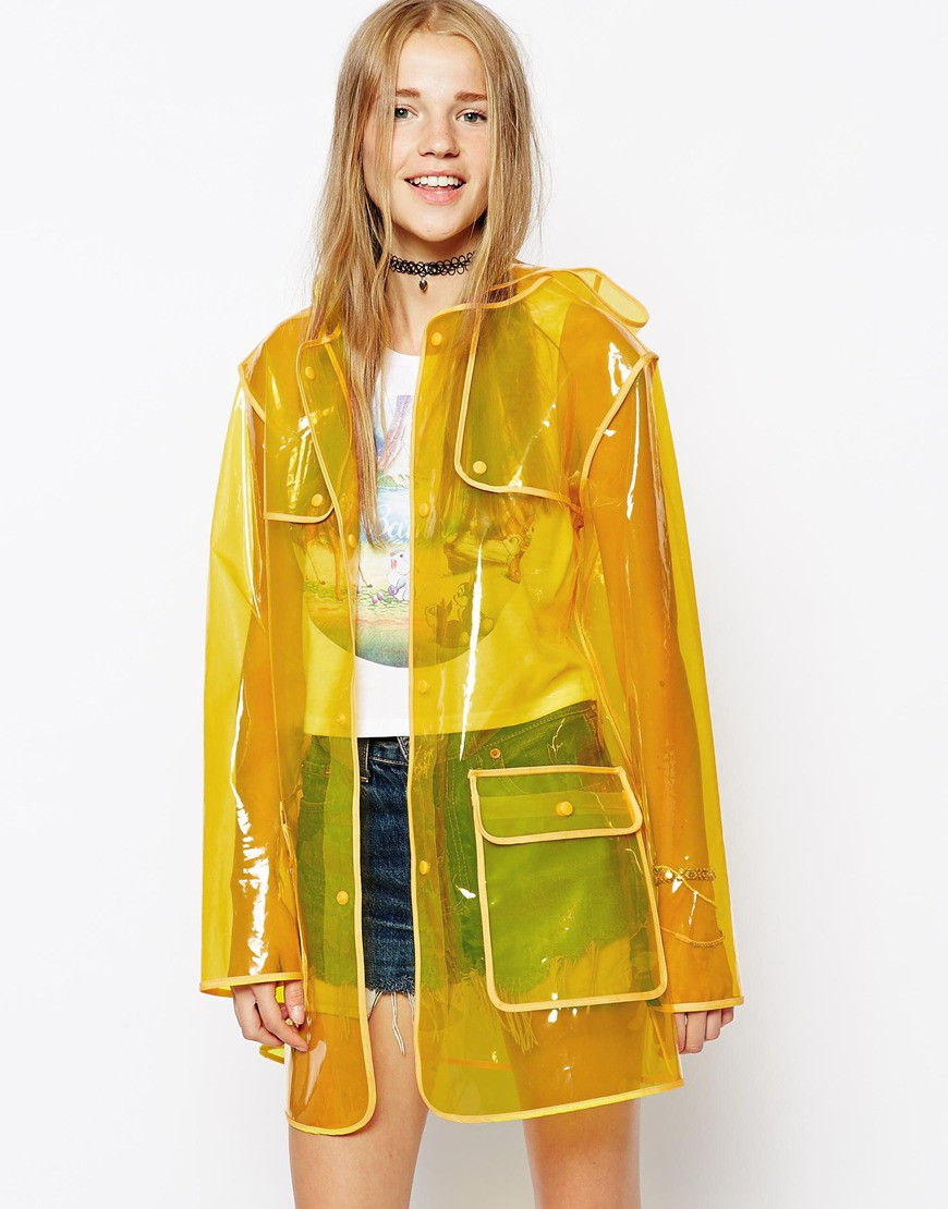 Seguimos con algo un poco más arriesgado y de los más innovador este año y es un chubasquero, no es como os lo estáis imaginado, sino algo transparente y de colores más llamativos para ponerse encima de tu look incluso cuando no esta lloviendo. Yo lo he visto en tiendas como Mango y Brownie, donde los tienen en un tamaño más pequeño que lo que vais a ver a continuación.